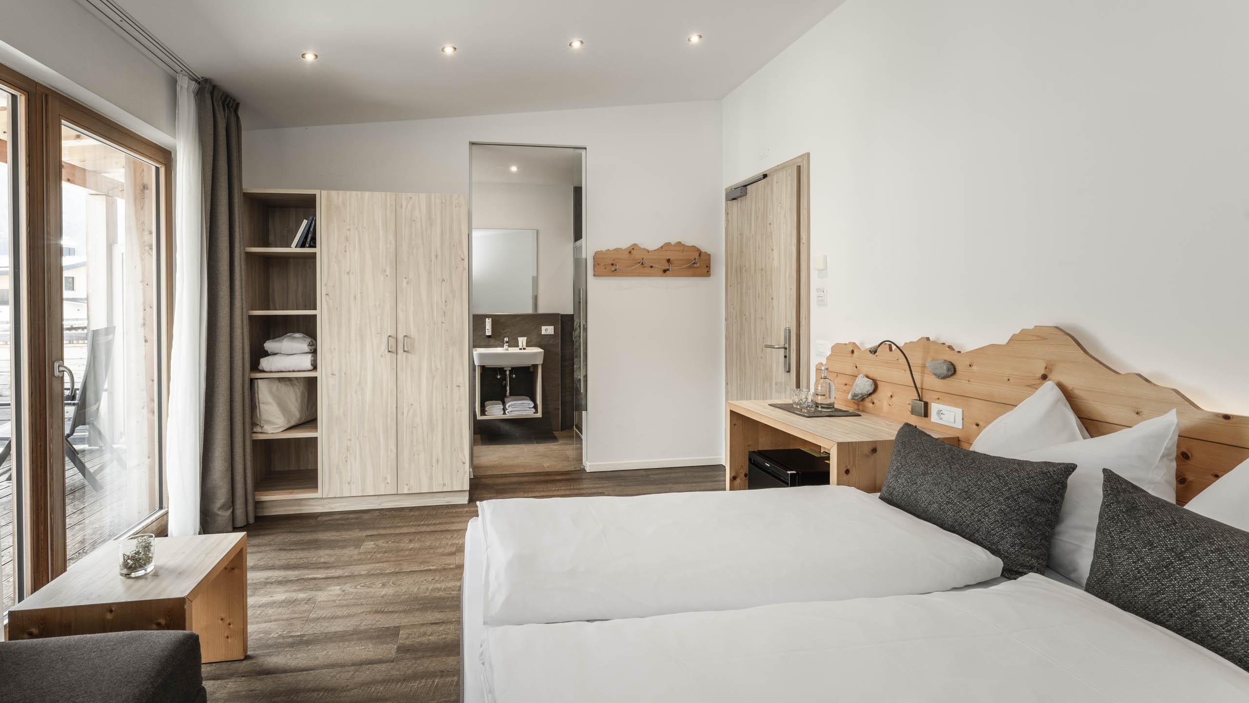 Here you can really relax and let your mind wander. This luminous double room caresses the soul and awakens the senses. The combination of furniture in light spruce wood, dark wood floors, and textiles in earthy colors creates a particularly comfortable environment. Our favorite “touch”: the panoramic terrace or the balcony with breathtaking view of the Dolomites or of the Alps.