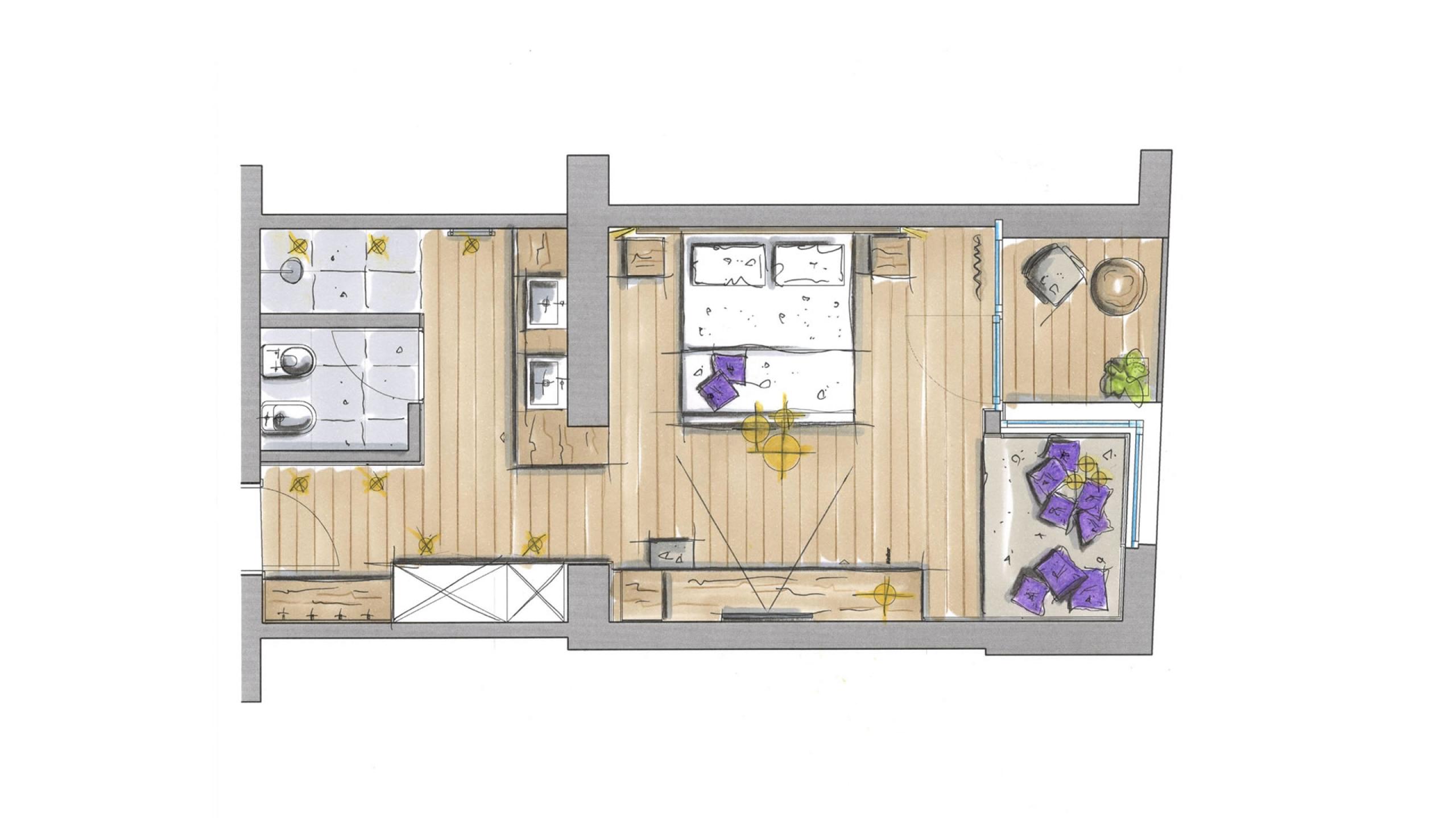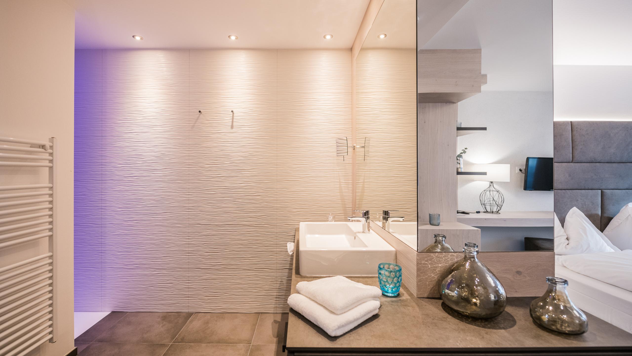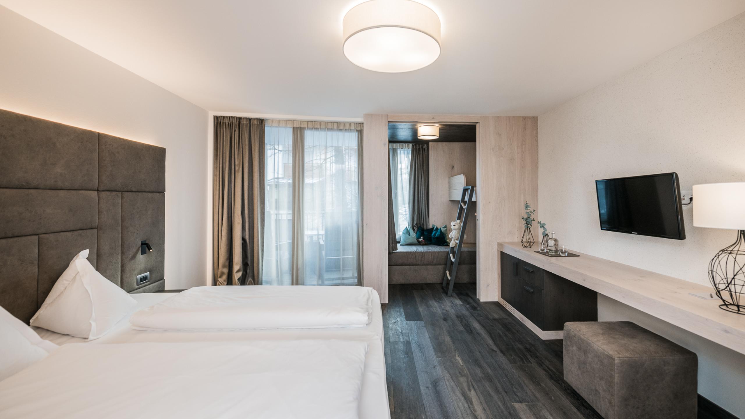 In questa Junior Suite Dolomites, design e comfort hanno un sapore del tutto naturale. Gli arredi sono in rovere pregiato con accenti di colori moderni. In parte le camere dispongono di un piccolo spazio diviso della camera dei genitori