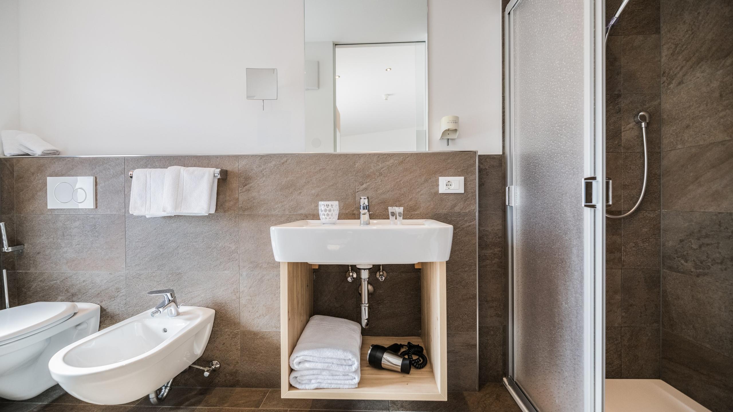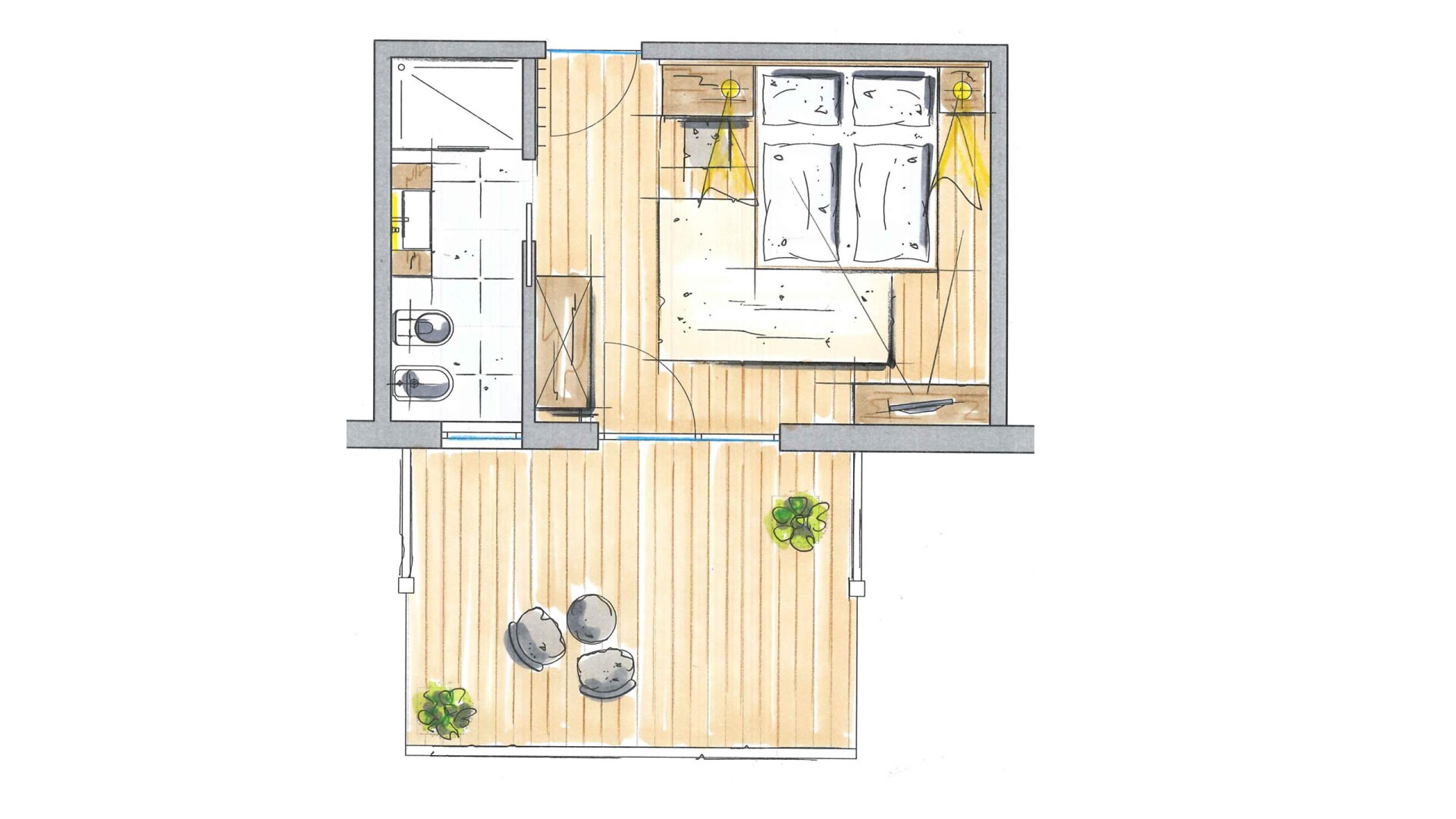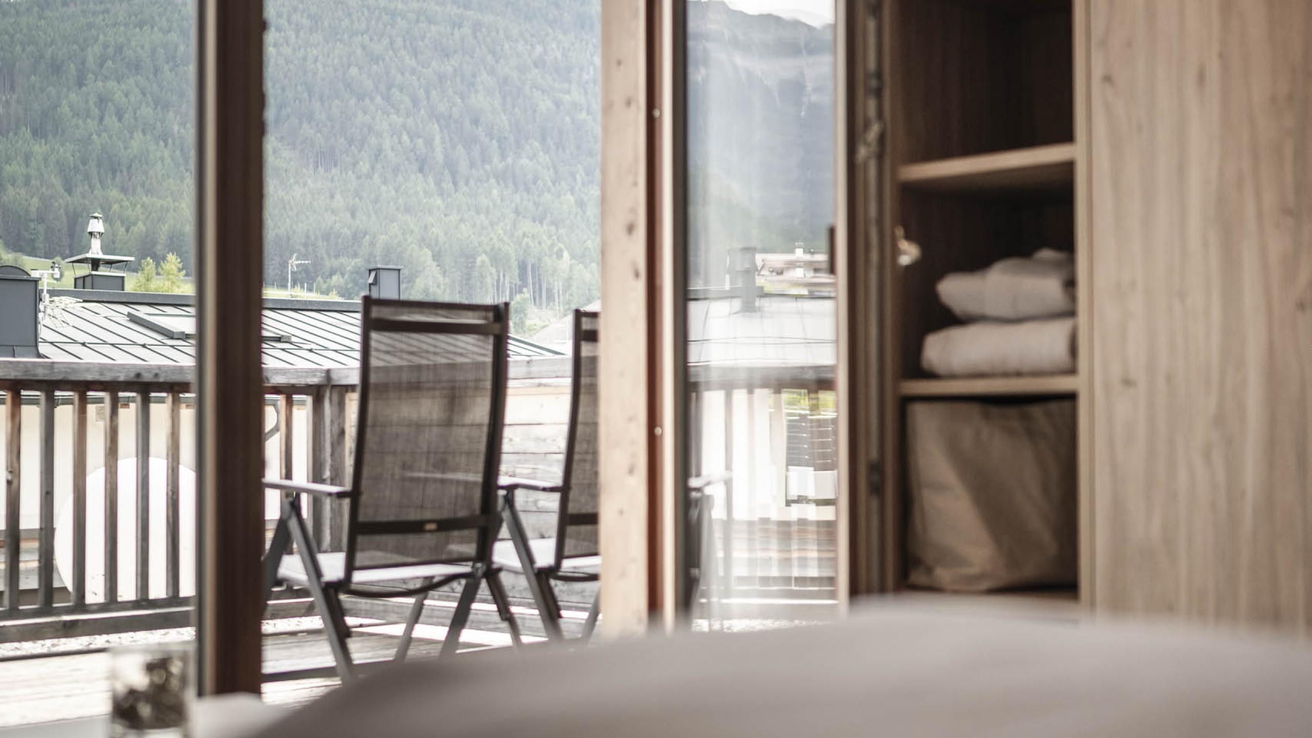 Hier lässt es sich herrlich entspannen. Dieses helle Doppelzimmer belebt die Sinne und hebt die Stimmung. Für ein besonders Wohlfühlambiente sorgt die Kombination aus heller, hochwertiger Fichte, dunklen Holzböden und erdfarbenen Textilien. Unser absoluter Lieblingsplatz: die Panoramaterrasse oder der Balkon im dritten Stock mit Blick auf die umliegenden Berge.